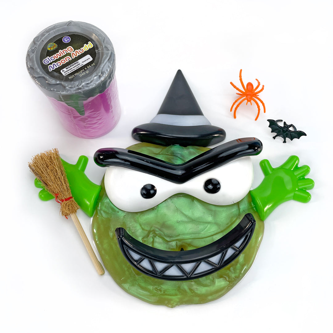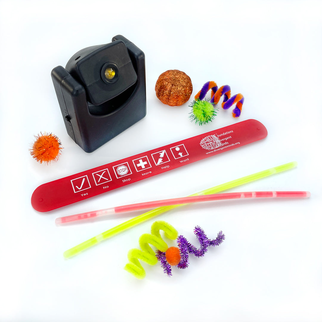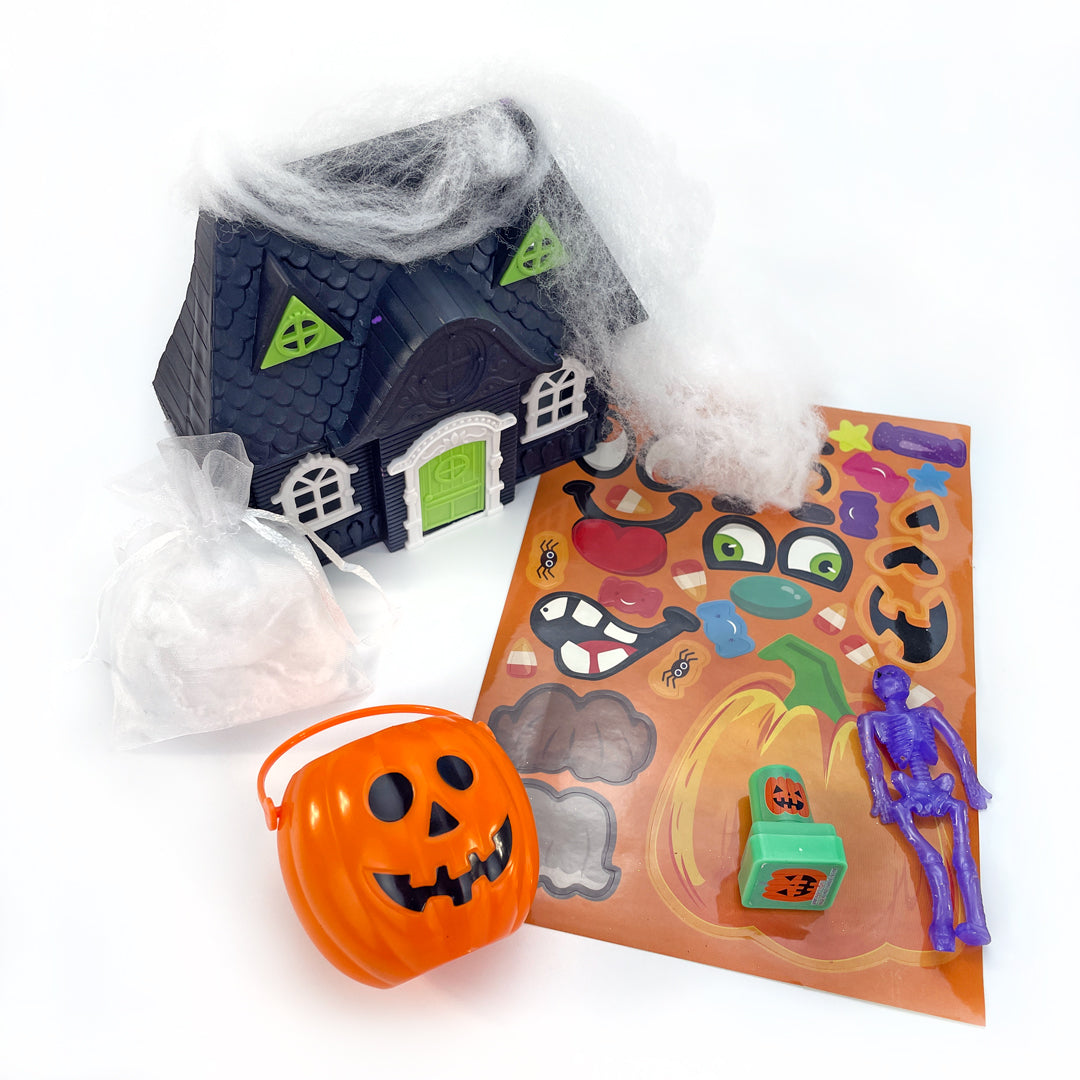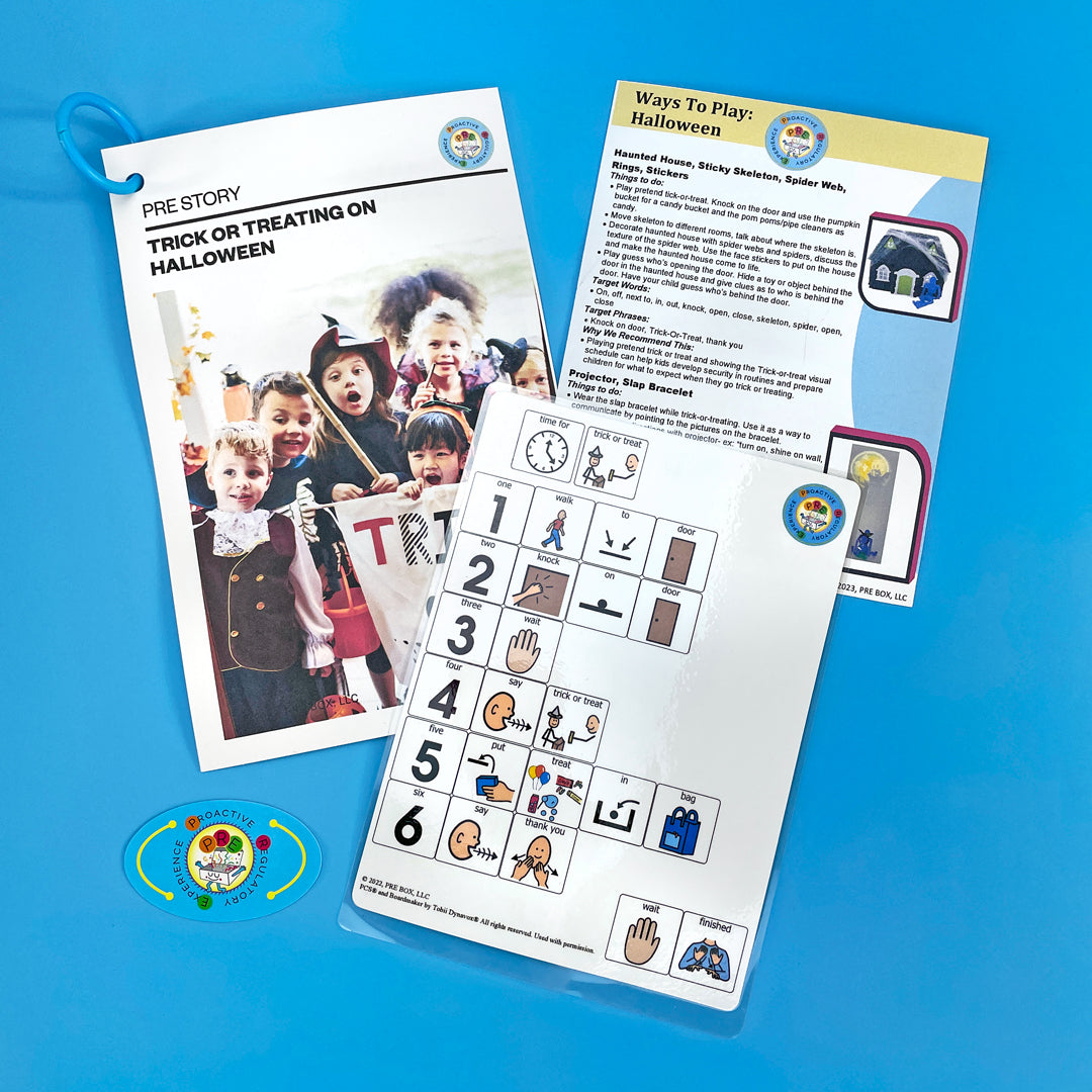 The Halloween Sensory box includes 2 Glowing Moon Mudd, stickers, spider webs with spiders, Halloween projector, witch parts and broom, a stamp, glow stick, haunted house and more. You will receive our Halloween PRE Story, trick-or-treat visual steps, and a Ways to Play parent handout. This box has everything you need to pretend trick-or-treat and prepare children for October 31st!