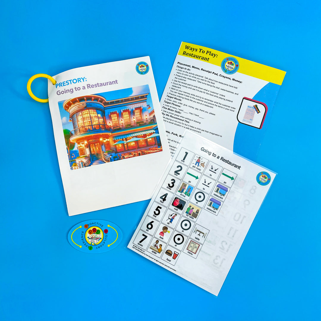 This Restaurant Sensory Box includes 2 Butter Slimes, food charm mix-ins, an apron, pretend money, pretend food, coloring kids' menu, and more. You will receive our Restaurant PRE Story, visual steps, and a Ways to Play parent handout.